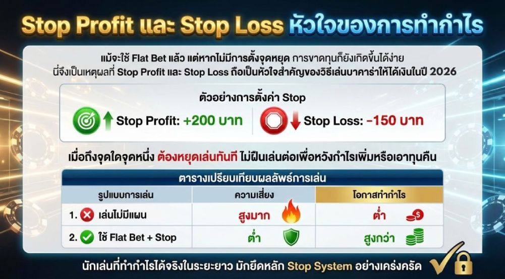 แม้จะใช้ Flat Bet แล้ว แต่หากไม่มีการตั้งจุดหยุด การขาดทุนก็ยังเกิดขึ้นได้ง่าย นี่จึงเป็นเหตุผลที่ Stop Profit และ Stop Loss ถือเป็นหัวใจสำคัญของวิธีเล่นบาคาร่าให้ได้เงินในปี 2569